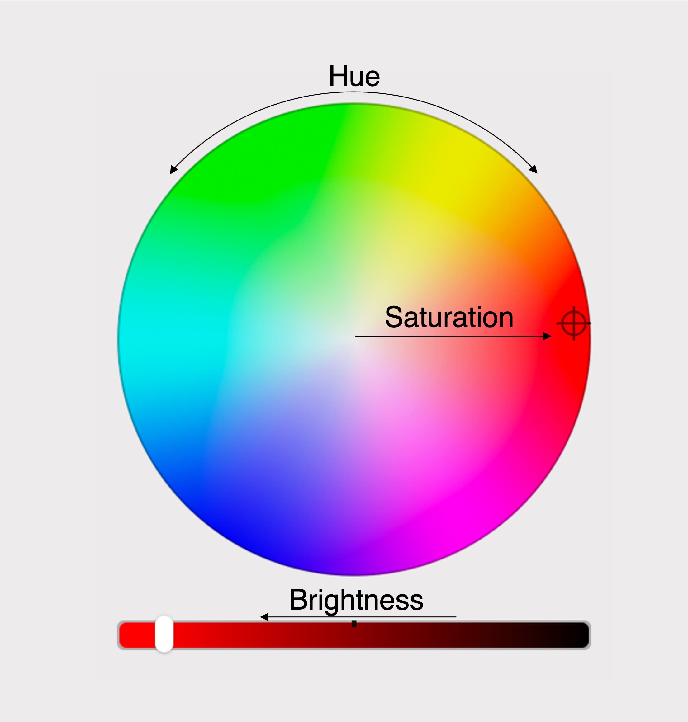 - brightness: this represents the total amount of light present. Darker colors are lower on brightness.